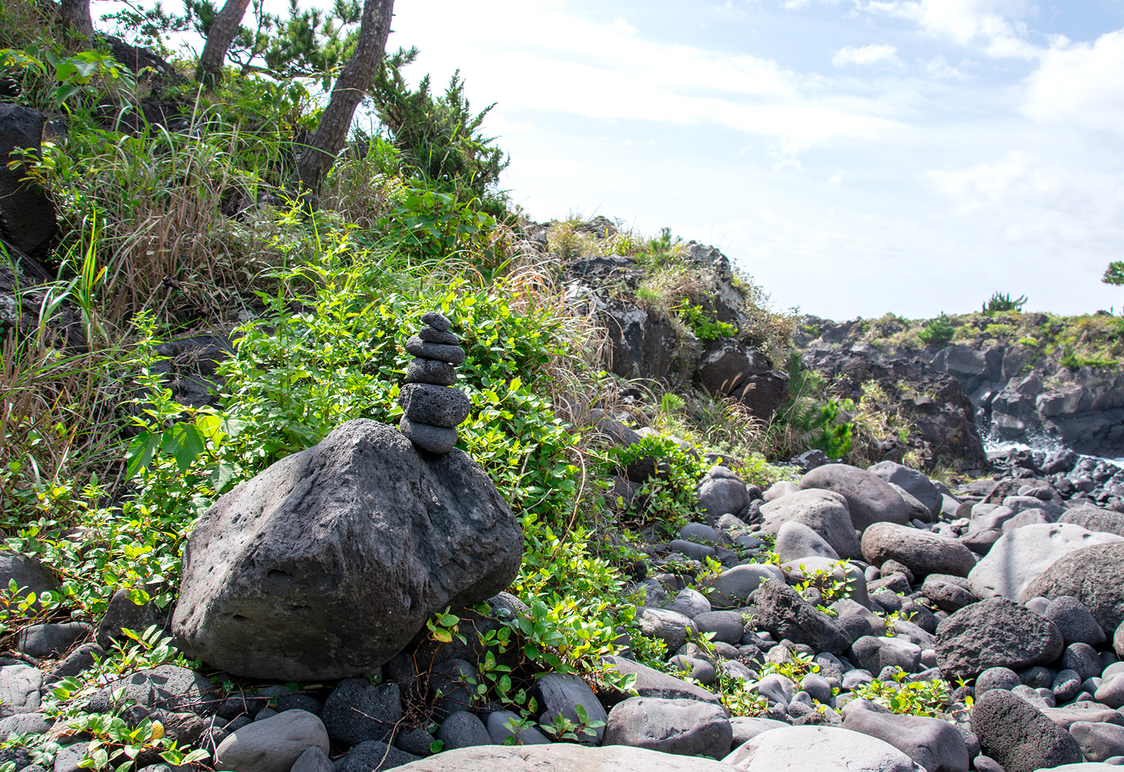 伊豆高原駅から数分のいがいが根駐車場(無料)から「いがいが根」を目指し歩き始めます。いがいが根に出たら左側(北側)に数分歩くと「かんのん浜」と書かれた標柱の場所に着きます。ここから海岸線の岩場向かってゴロゴロとした岩の上を移動します。
