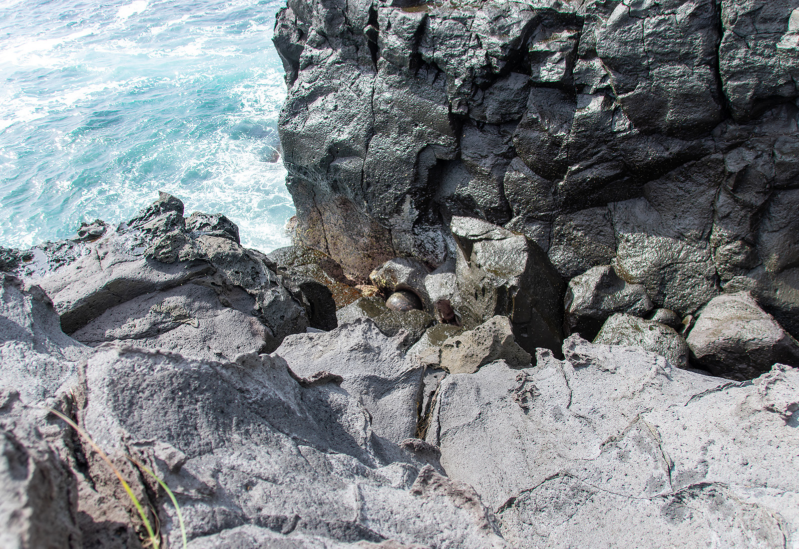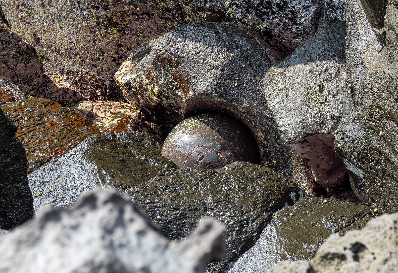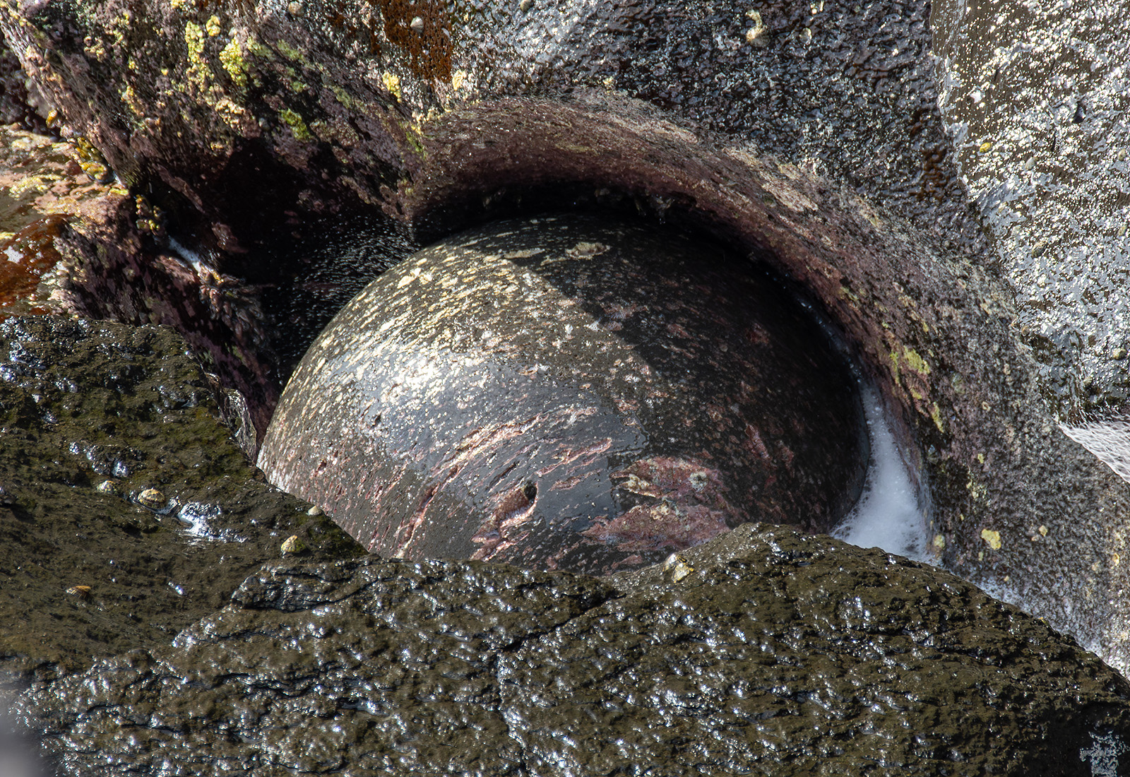 さらにアップの写真。波が打ち寄せると丸い岩がガタガタと動く様子が分かります。もっと荒い波だとぐるぐると回転しながら周囲の岩と擦れるのでしょう。そして、この丸い岩はいつの日か砕けて消滅する運命にあります。または周囲の穴が大きくなり波の力で飛び出してしまうのかもしれません。貴重な自然現象を観察できて良かったです。