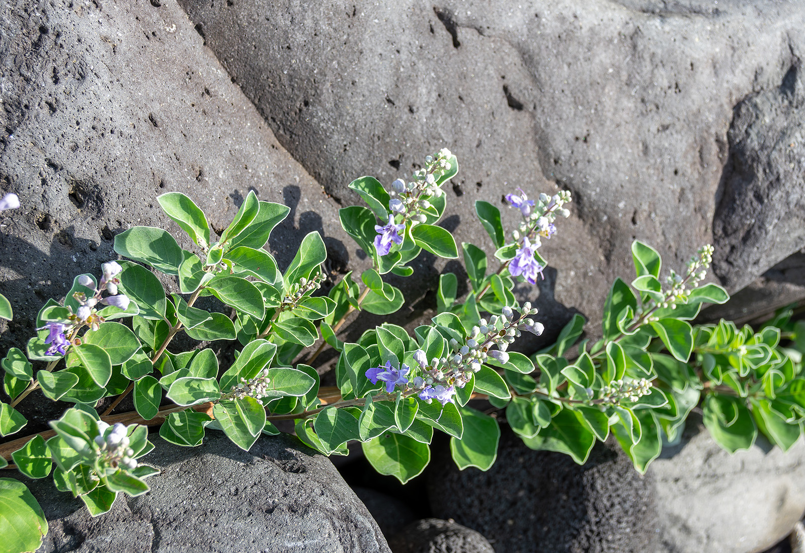 シソ科の海浜植物ハマゴウの花と葉が、荒涼とした景色の中で一際鮮やかでした。